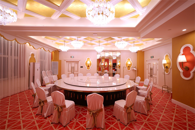 永利宮—優(yōu)雅大氣、雍容華貴,位于大酒店北樓一層,面積392㎡,可承接20桌的中小型宴會(huì)。